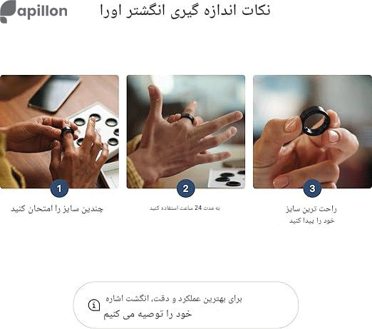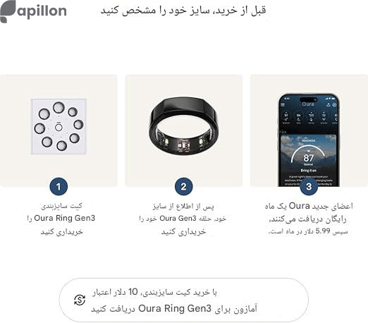 • توصیه می‌شود ابتدا از کیت تعیین سایز Oura Ring Gen3 استفاده شود.