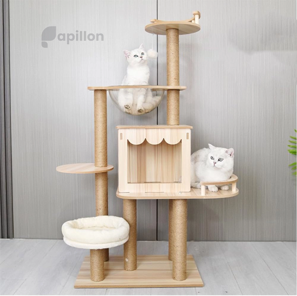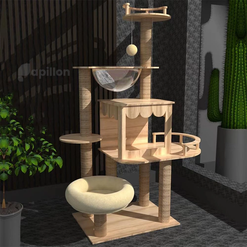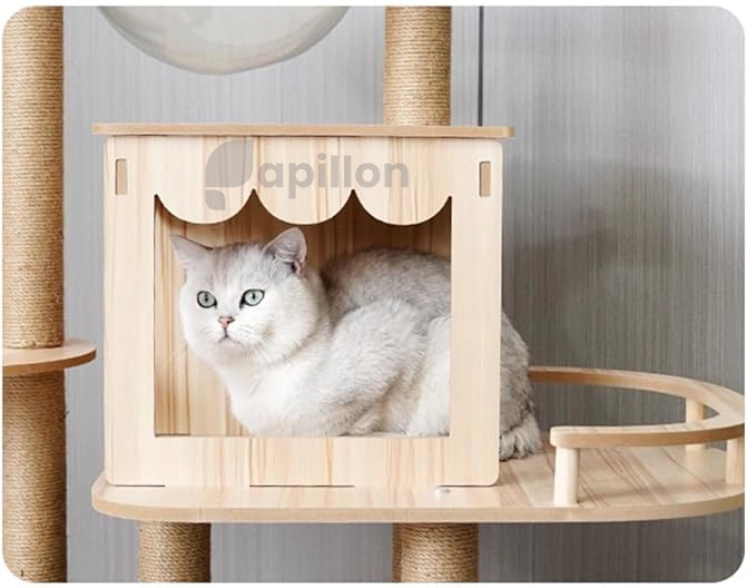 اگر گربهتان عاشق بالا رفتن از سطوح، بازی با اسباببازی و لم دادن در مکانهای دنج است، این درخت مدرن همهی آنها را یکجا دارد. پایهها از چوب مستحکم و تخته مهندسیشده ساخته شدهاند تا ایمنی و پایداری کامل را فراهم کنند. هر طبقه بهنرمی با تشکهای پشمی پوشیده شده تا استراحتی شیرین برای گربهتان فراهم شود.