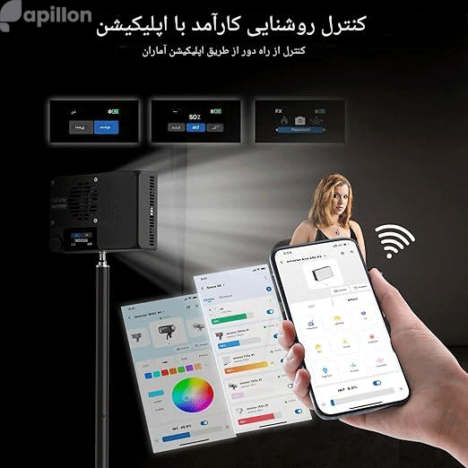 - کنترل: دارای صفحه نمایش رنگی و کنترل از طریق اپلیکیشن بصری آماران (Amaran App).