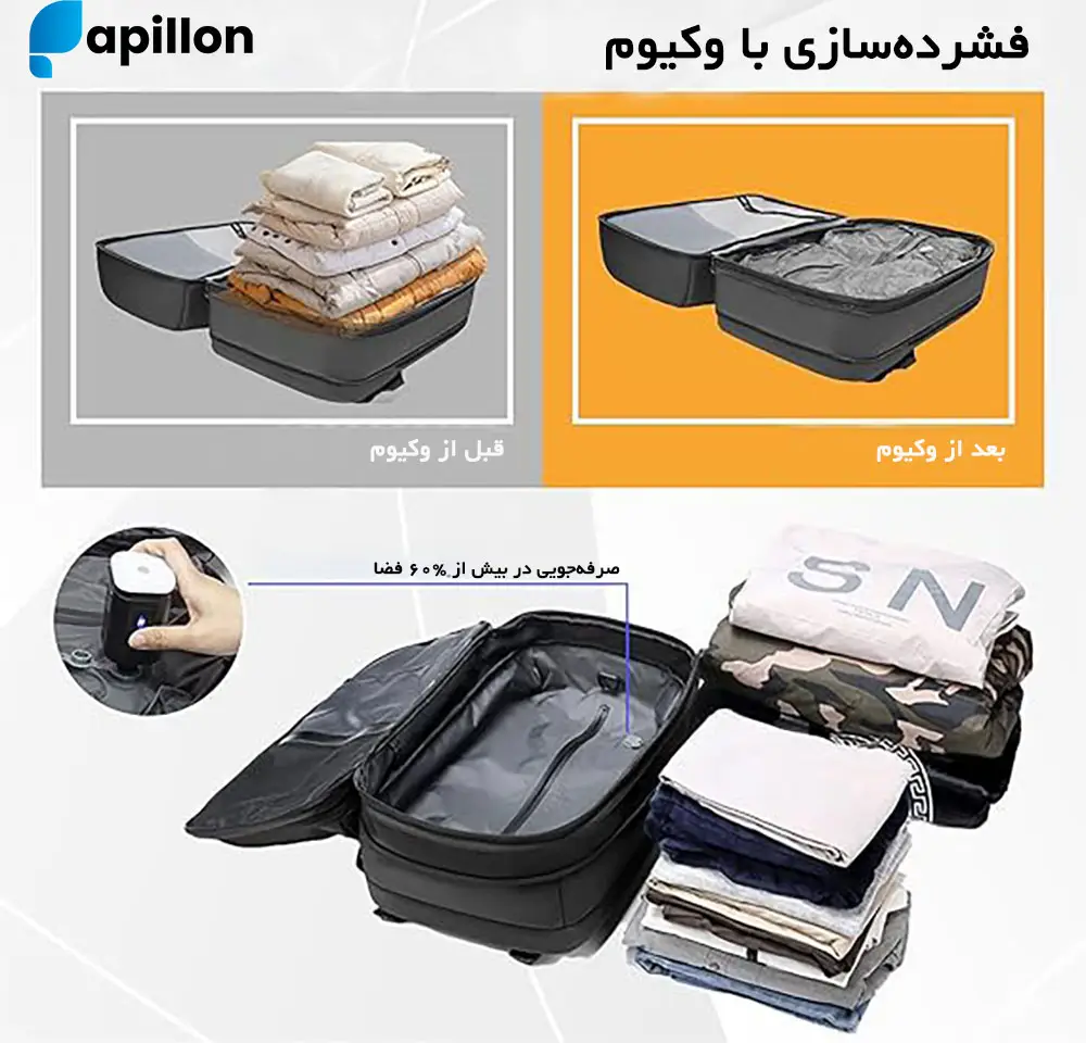 - تکنولوژی پیشرفته: سیستم وکیوم با پمپ داخلی امکان فشردهسازی حرفهای وسایل را فراهم میکند.