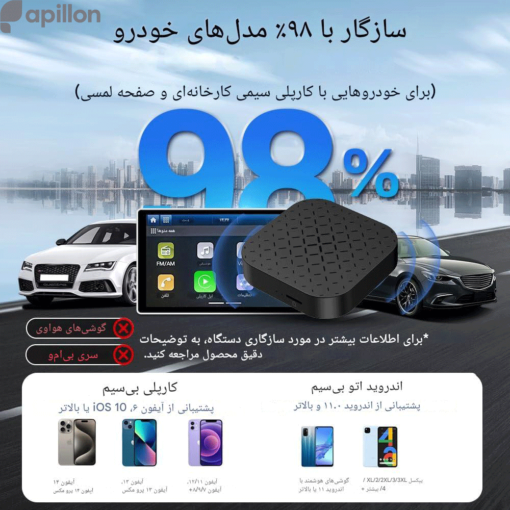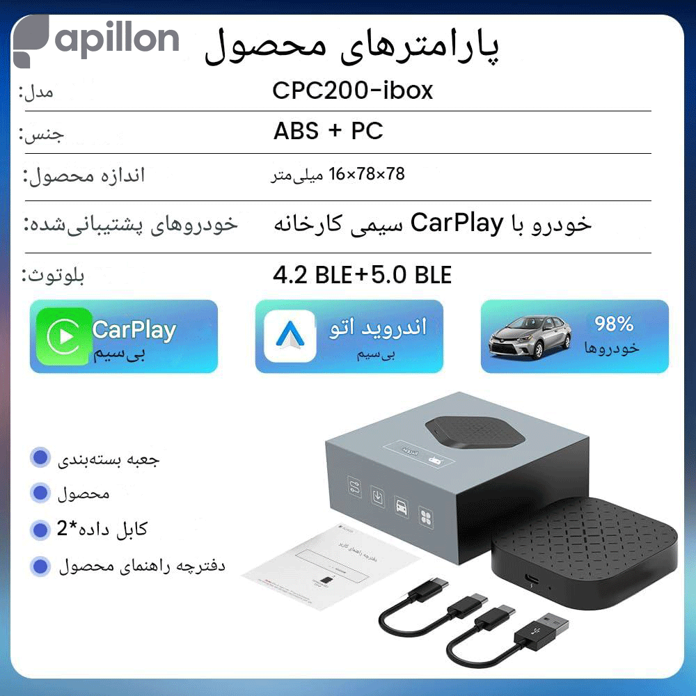 | سازگاری خودرو | بیشتر خودروهای دارای CarPlay سیمی + صفحه لمسی (بهجز BMW) |